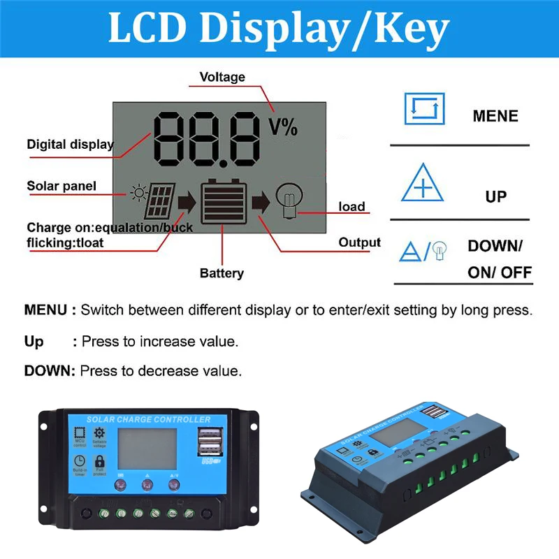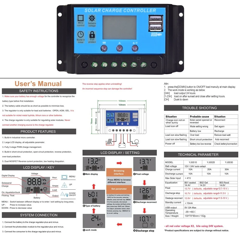 g. The overall power of the photovoltaic module must be less than the rated power of the controller (rated voltage × rated current). It is strictly prohibited to overload the controller.