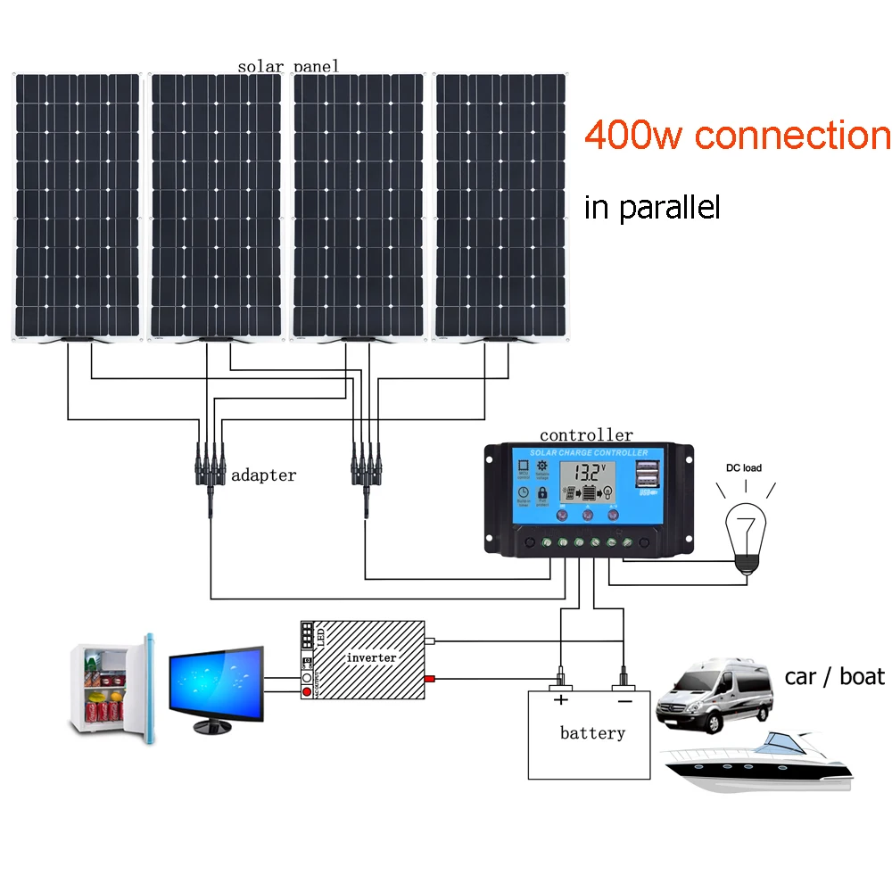 400W solar panel system kit complete camping power with 12V OR 24V To 110V 220V 1000w inverter Charger Lithium/Lead Acid battery
