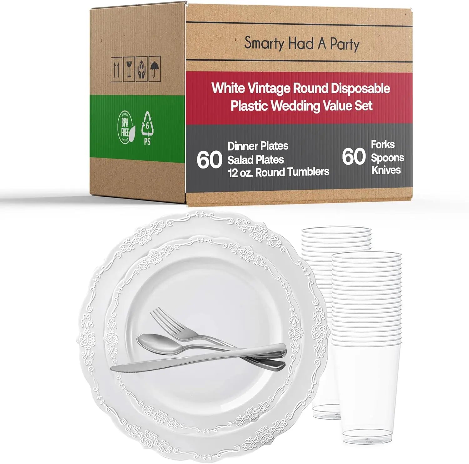 - Includes plastic plates, disposable cutlery, and clear cups to cover all dining needs for up to 60 guests, so you can set the table quickly.