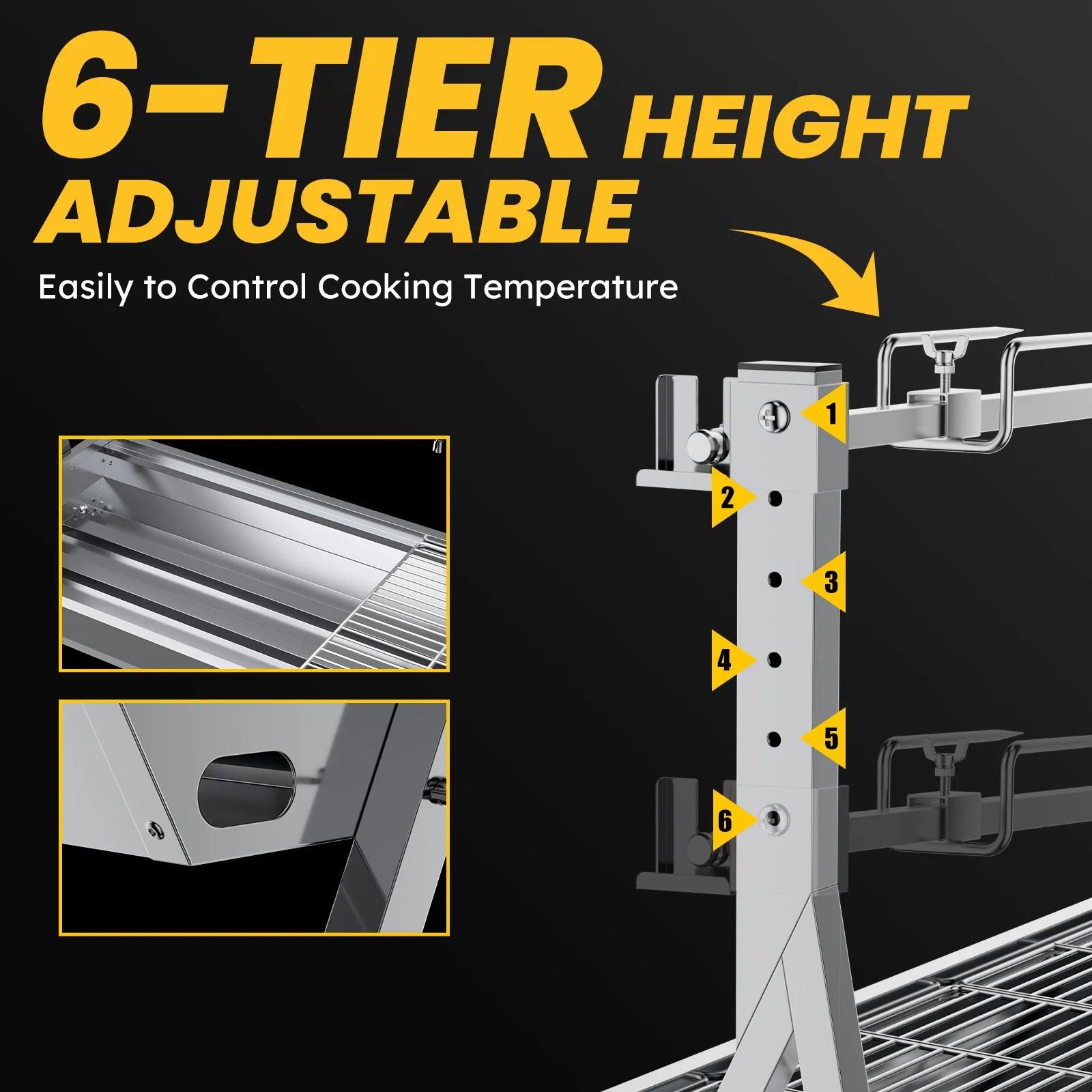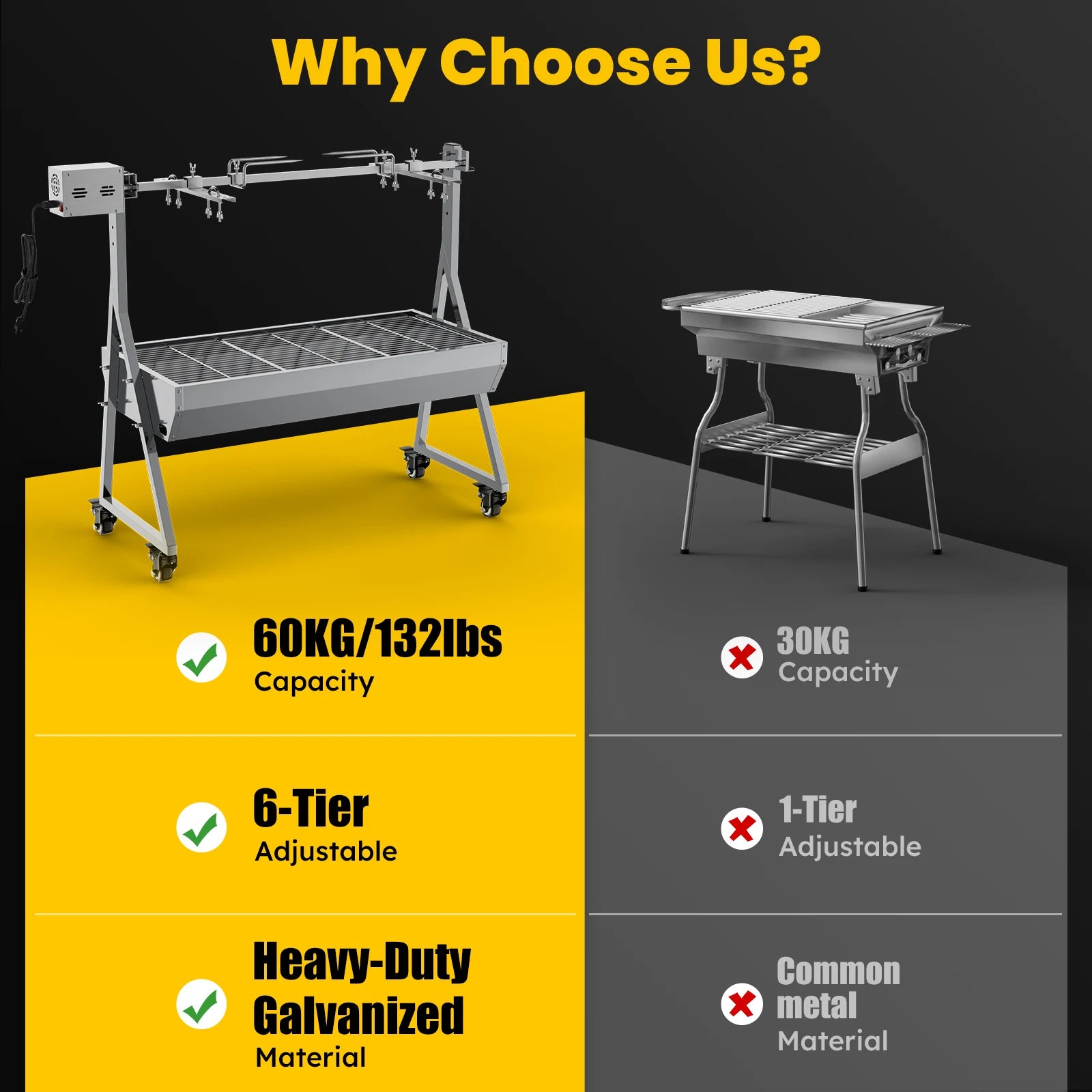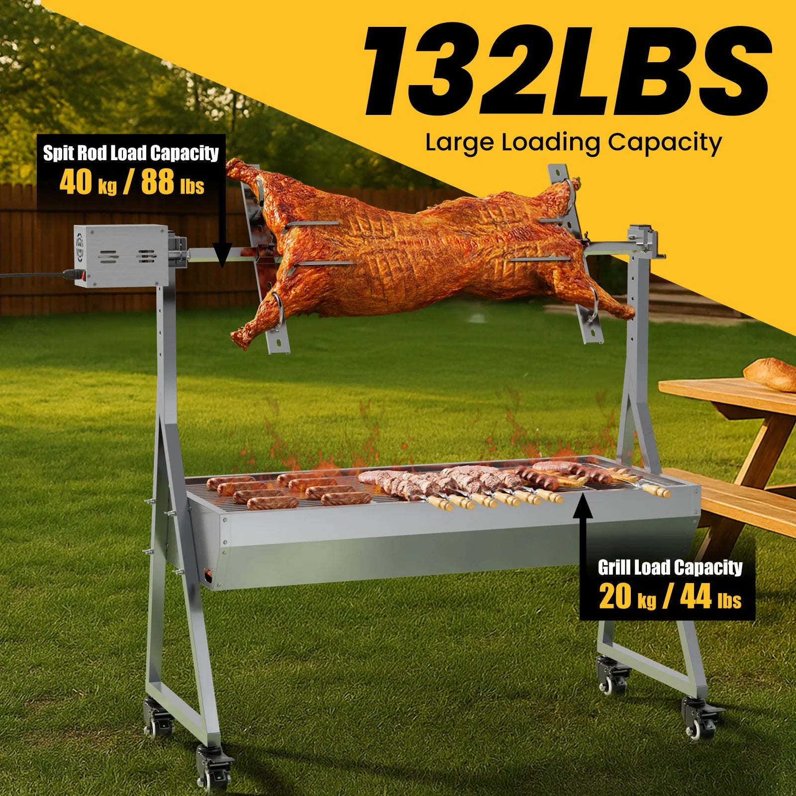 - 132 lbs (60 kg) heavy-duty capacity lets you roast whole lambs, pigs, or multiple dishes at once, with automatic grill forks and a 44-lb grill net included.