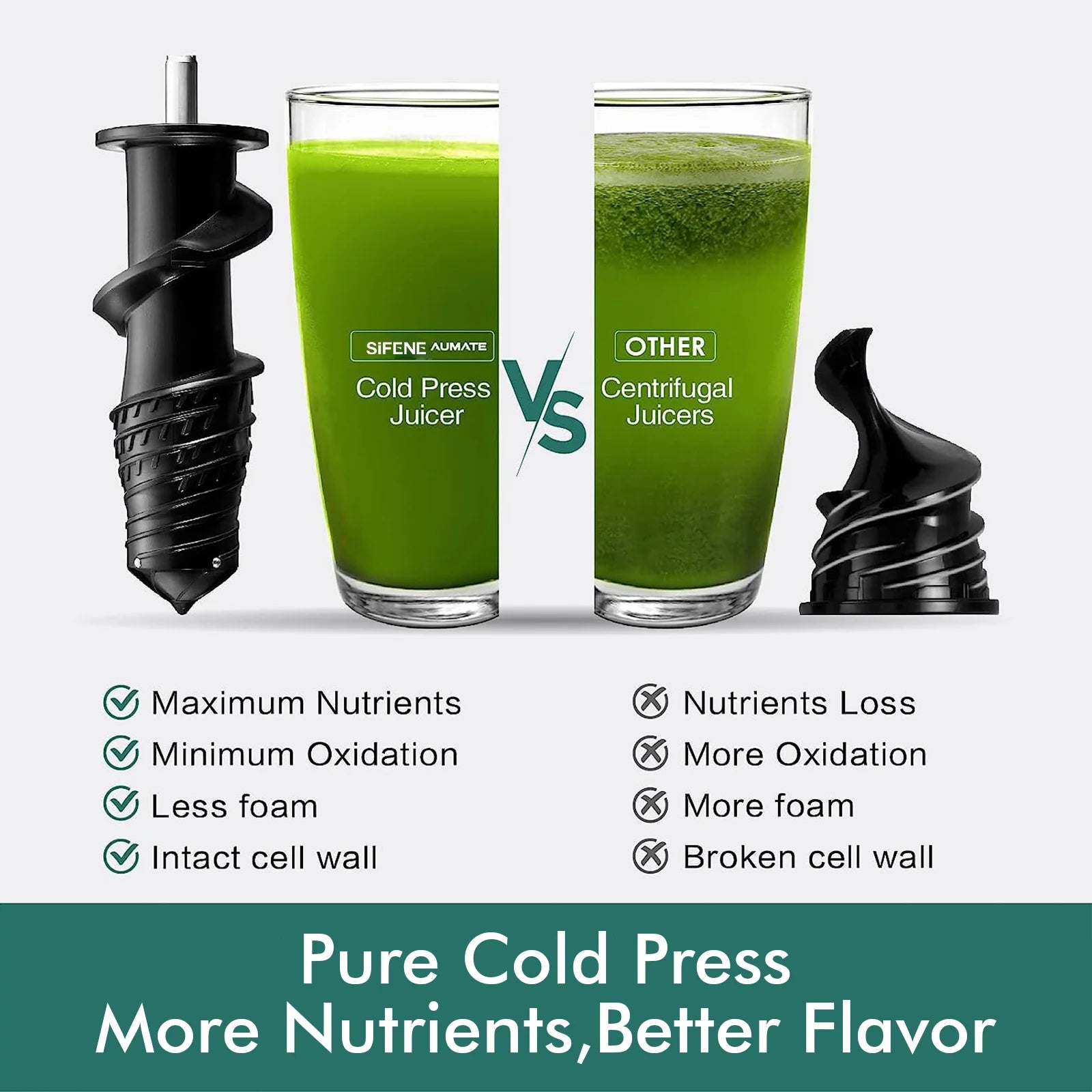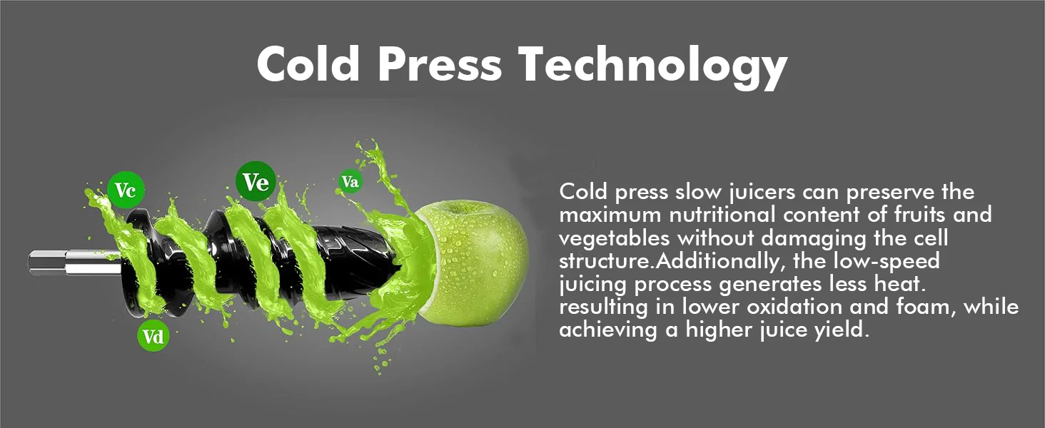 【Slow & Steady Wins】Delving into each fruit and vegetable at a gentle pace, our cold press juicer preserves the integrity of your produce, offering less oxidation and longer-lasting freshness.